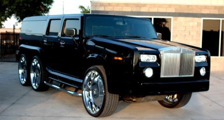 El colmo del mal gusto. No encuentro palabras para calificarlo, o más bien para descalificarlo. Esta monstruosidad es un Hummer H2 con carrocería modificada, seis ruedas, unas llantas que parecen paelleras y un frontal que pretende imitar al Rolls-Royce Phantom.