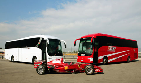 Con vosotros la última adquisición del equipo Ferrari de Fórmula 1. Es un autobús Iveco Irisbus Domino HDH, con motor Cursor 10 Euro V de 450 CV, turbodiesel. Se trata de un encargo muy personalizado para el equipo, pintado en color Rosso Scuderia. Se utilizará para transportar a pilotos pero también para acoger a medios de comunicación y actividades de promoción.