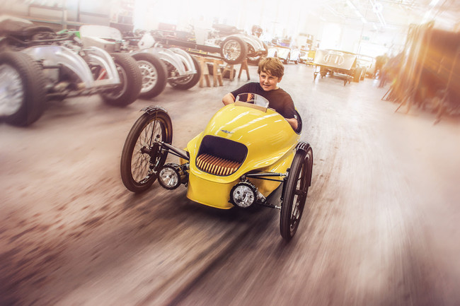 El pequeño Morgan EV3 Junior no alcanza 160 km/h como su hermano mayor, ni tampoco acelera de 0 a 100 km/h en poco más de ocho segundos, puesto que está limitado a 16 km/h (también tiene marcha atrás), pero sí luce una carrocería de fibra de carbono, salpicadero de madera y una tapicería de cuero cosida a mano. Los colores exteriores de serie son rojo, verde o marfil, aunque en opción se pueden pedir más de 40.000 tonos.