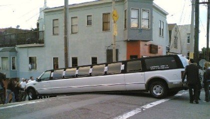 Vaya si importa el tamaño. Y si no que se lo cuenten al conductor de esta limusina, que o bien por creerse que la tiene más pequeña de lo que realmente es (me refiero a la limusina), o bien por mero despiste, se ha quedado encallado en pleno cambio de rasante en esas tremendas cuestas que podrían ser de San Francisco. Los vecinos (supongo, aunque podrían ser los ocupantes del cochecito) se han mostrado solidarios y se afanan en quitar la inutil máquina de su estado.