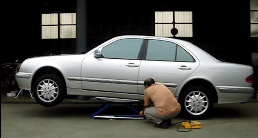 Como puedes ver en el vídeo sólo levanta un eje, pero se puede bascular el coche e ir alternando. Deja suficiente altura libre como para trabajar sin agobios y, claro, hay que estar tumbado debajo, no se puede estar de pie como en un elevador de taller. Cuenta con bloqueos de seguridad, pero no está de más poner unas borriquetas antes de meterse debajo.
