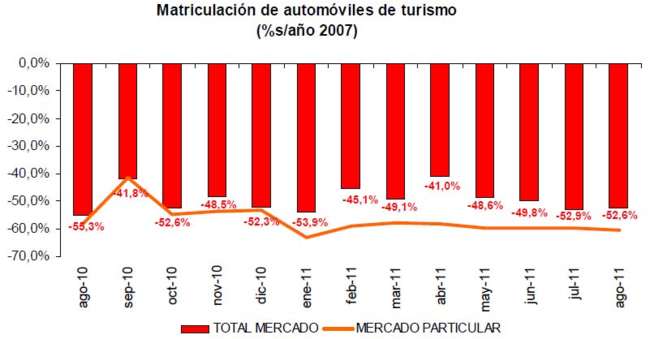 Comparando 2011 con 2010, hay un descenso del 22,2% en las ventas, 568.354 unidades. Se espera terminar el año con menos de 900.000 coches vendidos, en un país donde cuando la economía va bien, hay unos 1,2 millones de unidades vendidas o más. Hay que retroceder a hace 20 años para recordar otro agosto con menos de 50.000 ventas.