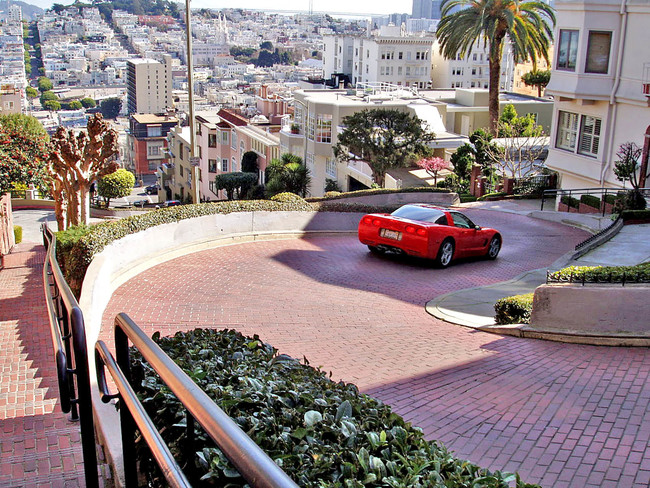Lombard Street es sin duda la más famosa de las calles extrañas (al menos en la porción que nos interesa), aún así, no podía dejar de mencionarla. En el momento de su construcción, las autoridades consideraron que su pendiente de 27 % era demasiado para los coches, así que añadieron ocho curvas a lo largo de 400 metros y la convirtieron en un puerto de montaña a escala, reduciendo la pendiente para los coches hasta un 16 %.