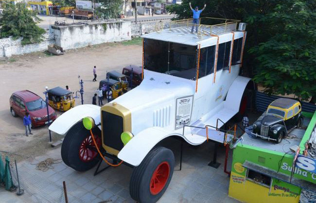 En la ciudad India de Hyderabad, al sur del país, existe un llamativo museo de artilugios y vehículos de todo tipo, cuyo creador, Sudhakar Yadav, ha fabricado los doscientos cacharros allí expuestos. Ahora, a modo de reclamo, el bueno de Yadav ha confeccionado un enorme Ford Tourer de 1922, de ocho metros de altura, que es el doble de alto que un autobús londinense de doble piso.