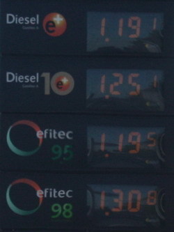Nota: La fotografía son los precios en una gasolinera ayer. Parece que la gasolina vuelve a superar el precio del diésel (salvo que sea un error en el cartel), aunque posiblemente no sea representativo de la tendencia actual.
