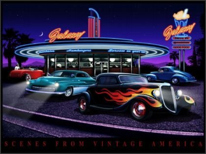 Este y otros cuadros que se pueden ver en su web han sido realizados por Helen Flint y represantan casi a la perfección la cultura americana de las décadas de los 50 y 60, incluyendo en ellos figuras tan míticas como Elvis Presley, James Dean o la tentación hecha mujer, Marilyn Monroe.
