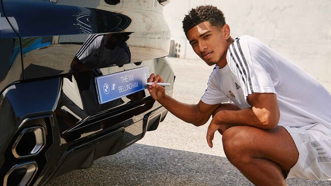 Jude Bellingham posando junto al BMW XM de patrocinio que no conduce.