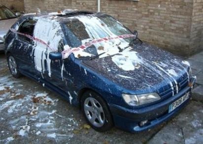 Lo que véis en la imagen es la cruel forma de vengarse que ha tenido Bam Margera y su socio de ‘Jackass’ Steve-O contra alguien de la organización del programa de la Gumball 3000. Por lo visto, al dueño de este pobre Peugeot 306 grabaron haciendo burnouts con el Lamborghini Gallardo de Bam Margera.