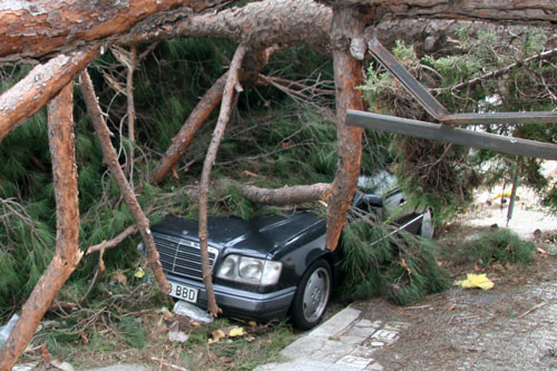 Así que tenedlo en cuenta: la lluvia actúa de manera muy distinta al viento, y un árbol no siempre es un amigo, especialmente si está viejo (o si quieres empotrarte en él). Ignoro si el seguro del Mercedes era total, y lamentablemente no pude quedarme a ver cómo lo destapaban para apreciar mejor los daños. Sólo me llevo la moraleja: mejor en el Parking.