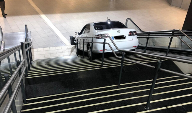 Surrealista capítulo se ha vivido en el interior del intercambiador de Plaza Elíptica en Madrid: un Mazda6 ha quedado atascado en las escaleras que dan acceso al Metro tras precipitarse desde la primera planta.