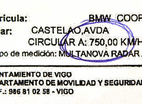 Cuando la conductora, cuyo nombre no ha trascendido, recibió una multa por circular a 750 Km/h por una calle céntrica, no sé si se reiría o si se desmayaría. Aplicando el coeficiente de corrección, se queda la cosa en sólo 712 Km/h. Naturalmente la mujer ha recurrido, ya que no posee un Volkswagen Gol, por tanto la infracción es imposible.