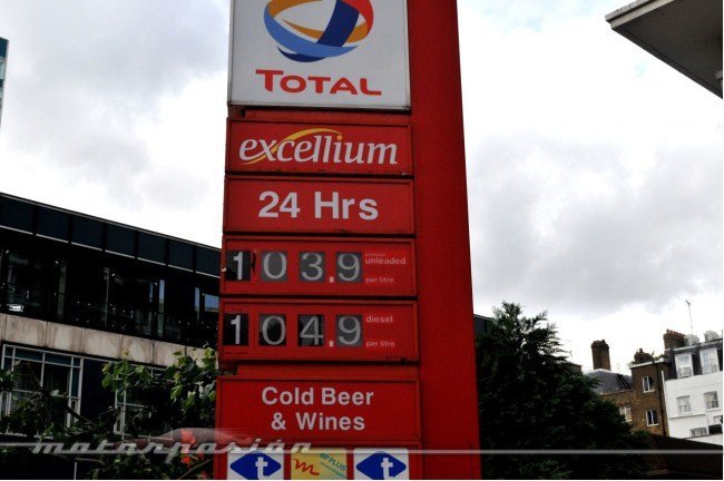 Nota: La foto es de 2009, a día de hoy los combustibles en el Reino Unido cuestan de media 1,32 libras por litro (95 octanos), 1,33 libras por litro (98 octanos) y 1,375 libras por litro (diesel).