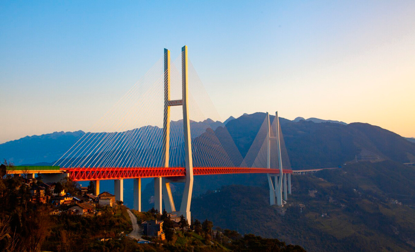También conocido como puente del Beipan (Beipanjiang) se corona como el más elevado del mundo. Se ubica al suroeste de China y sobrevuela un espectacular valle a más de medio kilómetro de altura. Además, también tiene el honor de ser uno de los puentes atirantados más altos del planeta en lo que respecta a estructura (su torre más elevada mide 269 m).