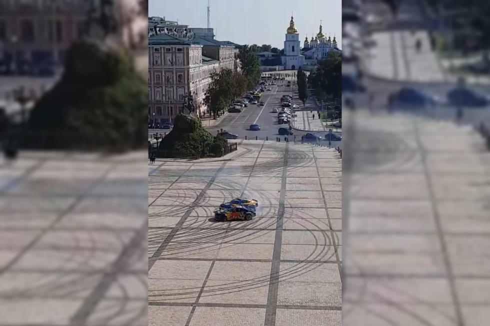 Red Bull ya ha retirado tanto las fotos como el vídeo de sus redes sociales, pero en las imágenes que compartió el teniente de alcalde, puede verse cómo un Nissan 350Z y un Silvia S15 modificados para la ocasión, realizan largas derrapadas alrededor de la estatua de Bogdan Jmelnitsky.