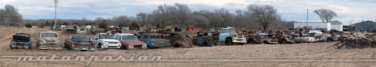 Al salir de la autovía nos equivocamos de desvío y cogemos otra dirección pero, como no hay mal que por bien no venga, nos encontramos con una especie de desguace de vehículos antiguos, a modo de cementerio de clásicos (ver foto). Parada obligatoria e interesante.