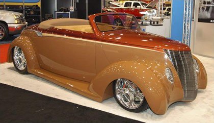El que veis en la imagen es un 1937 Ford Convertible llamado “Chocolate Thunder” y fue expuesto por primera vez en el pasado SEMA Show en Las Vegas. Y ahora vuelva a ser noticia porque ha sido robado junto al trailer que lo transportaba del parking de un hotel. El conjunto (trailer más coche) está valorado en más de 350.000 euros.