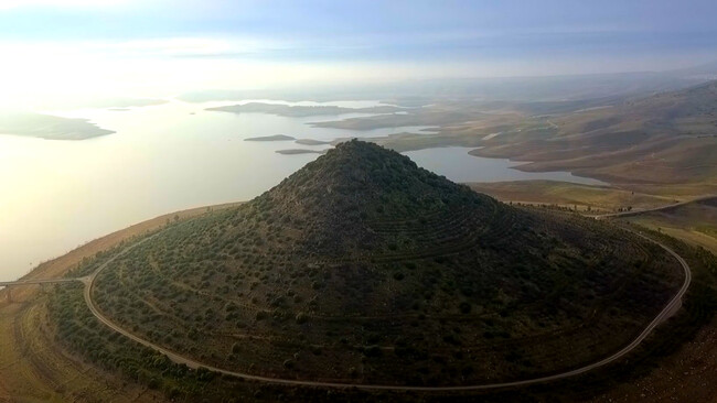 Una de las carreteras más curiosas que podemos encontrar en España es la que enmarca el Cerro Masatrigo, en Badajoz (Extremadura). Se trata de una vía circular en la base de este peculiar cerro rodeado por agua casi al completo.