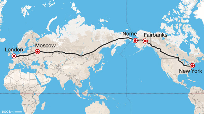 En caso de que Alaska construyera una vía entre Nome y Fairbanks, cosa que ya se ha estudiado en otras ocasiones, el hipotético viaje entre Londres y Nueva York tendría una longitud de unos 20.777 kilómetros, que se dice pronto. ¿Quién pagaría este proyecto? Pues no está muy claro, pero desde luego no sería barato, no.