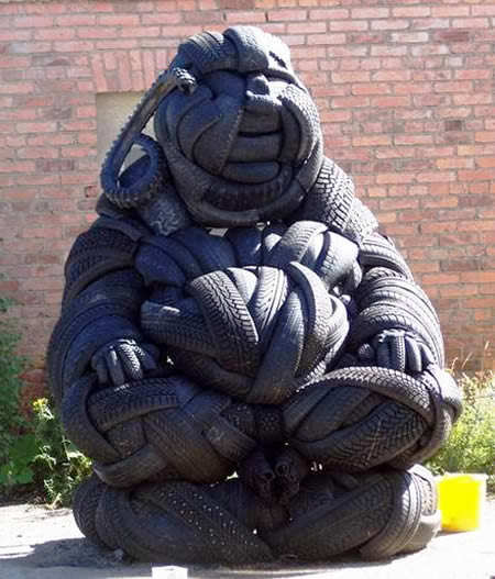 A partir de ahí es cuestión de elegir: o dejamos que transformen las que fueron nuestras gomas en polvo para asfalto, o las dejamos como combustible para manifestaciones… o las dejamos en manos de Yong Ho Ji para que cree arte a base de ruedas. Y eso tenemos aquí: una escultura realizada en neumáticos viejos con un motivo que le viene que ni pintado: ¿Buda transmutado en Bibendum?