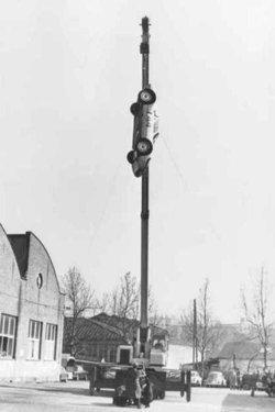 Esta imagen es de 1966, de uno de los primeros crash test que hizo la marca alemana Porsche. Lo que vemos es un Porsche 904 que está a punto de sufrir un mal de alturas. Lanzar un coche al vacío equivale perfectamente a una colisión a alta velocidad, mediante simples ecuaciones de física elemental.