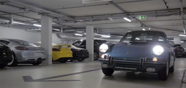 Al comienzo del vídeo, se ve cómo el Porsche 911 clásico que entra en el garaje del Museo Porsche pasa al lado de un Porsche Cayman de color amarillo, en cuya zaga llama poderosamente la atención un alerón de grandes dimensiones que según sabemos, no pertenece a ningún paquete de equipamiento aerodinámico opcional.