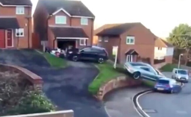Después de parar en medio de la cuesta, el coche sale disparado, perdiendo el conductor el control, golpeando al coche del al lado y acabando encima de otro vehículo aparcado en la calle.