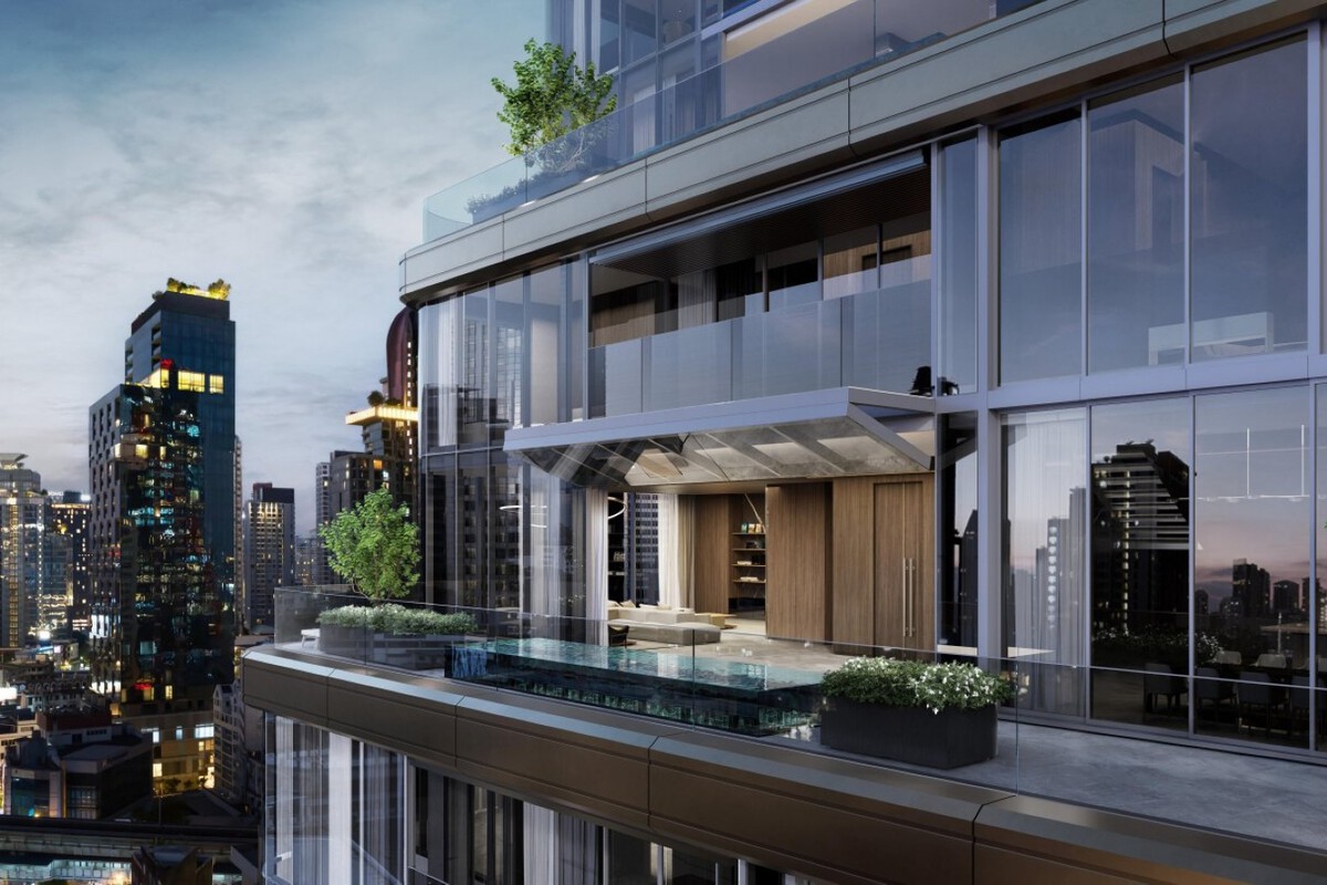 Ubicado en pleno Thonglor, uno de los barrios más caros y de moda de la capital tailandesa, el edificio tiene 21 plantas, 95 metros de altura y solo 22 residencias tipo Sky Villa: entre dúplex y cuádruplex de entre 525 y 1.135 m², con precios que arrancan en unos 13,8 millones de euros al cambio y pueden llegar hasta los 36,8 millones.