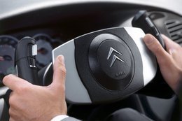 Este es el volante del prototipo Citroën C5 “by Wire”. Con él se maneja la dirección, el acelerador y el freno. Esta tecnología sustituye las conexiones mecánicas por las electrónicas (como sucede con los pedales de un fórmula 1); pero en este caso, todo en el volante.