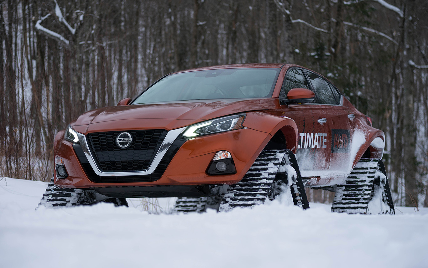 No, no es la primera vez que vemos a un modelo de Nissan con orugas en vez de ruedas, pero la marca nipona ha vuelto por estos fueros. Y esta vez no ha optado por un Juke como ya lo hiciera hace ya cuatro años con el NISMO RSnow, sino con el sedán coupé de tracción total Nissan Altima, que no se comercializa en Europa pero sí hace lo propio en Norteamérica. ¿Su nombre? Nissan Altima-te AWD Concept.