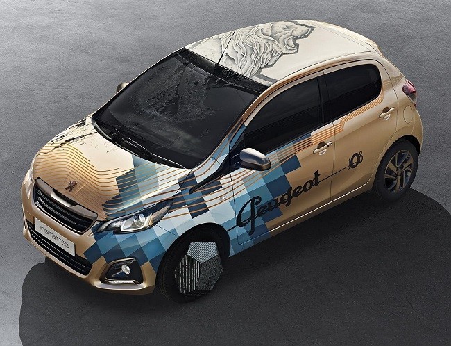 El Peugeot 108 Tattoo Concept aparece recubierto de una pintura cobriza dorada que simula el color de la piel. Sobre ella, en un intento de conjugar tradición y contemporaneidad, Xiol ha elegido el emblema que tenía Peugeot en 1920, un león fiero y conquistador, para inmortalizarlo sobre el vehículo junto a los trazos geométricos que son habituales en la obra del artista.