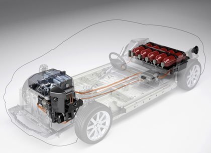 Pero su máxima característica es su propulsor. Como podéis ver en el esquema, está alimentado por una pila de hidrógeno. Cada bombona tiene una capacidad de 3 litros, y si se llenan todas ellas a una presión de 700 bares, puede almacenar hasta 3 kg de hidrógeno, dándole una autonomía de 350 km, pero limitado a 130 km/h. Como apoyo a esta pila de combustible, cuenta con una batería de ion-litio que se recarga con la energía generada en la frenada. Juntando ambas potencias, dispone de 95 CV, muy por encima de los 54 CV que da la pila de combustible. Peugeot no espera que este tipo de pila pueda estar en el mercado como sistema de propulsión para un coche antes de 2020.