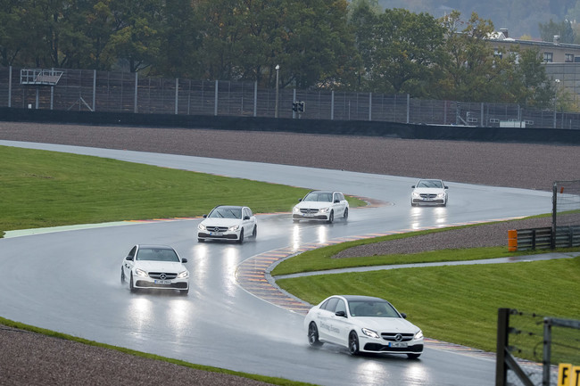 Para este curso en concreto los coches son un popurrí de modelos de la gama de Mercedes-Benz, incluyendo los Clase C, el nuevo Clase E (incluída una demostración de los nuevos sistemas de asistencia, como la frenada automática de emergencia o el asistente de aparcamiento, que también permite aparcar el coche de forma remota, como contamos ya aquí), dos C 63 Coupé. y los Mercedes-AMG C 63 S, listos para las pruebas de esta jornada, pasada por agua.