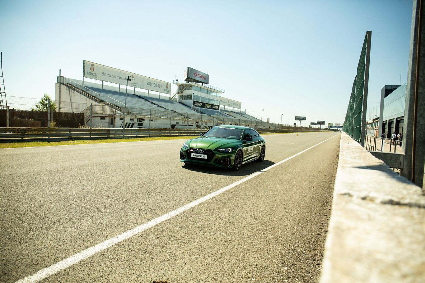 Empezamos por el plato fuerte de la jornada, saliendo al circuito principal de la pista madrileña para realizar una vuelta rápida con ligeras variaciones montados en el Mercedes-AMG A 45. Durante el primer tramo sin cambios en la pista pudimos comprobar cómo los Potenza Sport consiguen entrar muy rápido en temperatura y ofrecen un agarre consistente atacando incluso las curvas más rápidas con decisión.