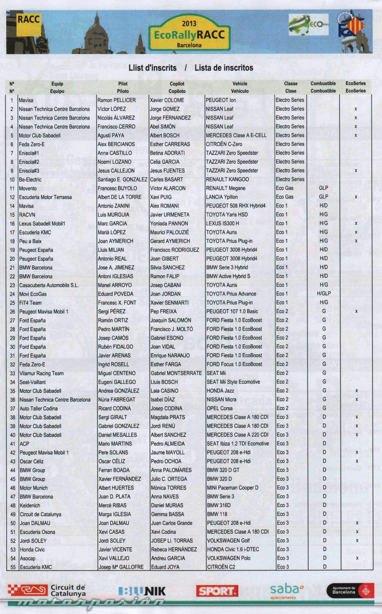 Participábamos un total de 55 vehículos: 110 pilotos y copilotos dispuestos a dar lo mejor de nosotros mismos en las categorías Electro Series (coches eléctricos), Eco Gas (GLP), Eco 1 (híbridos), Eco 2 (gasolina) y Eco 3 (gasóleo). De ellos, 21 vehículos participaban en el EcoRallyRACC como prueba puntuable para las EcoSeries.