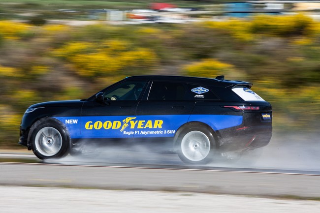 Pudimos comprobarlo de primera mano en una pista de frenado en la que con dos Range Rover Velar idénticos (uno calzado con los Eagle F1 Asymmetric 3 SUV y el otro con neumáticos de la competencia) con limitador de velocidad a 94 km/h realizamos pruebas de frenado sobre una pista encharcada.