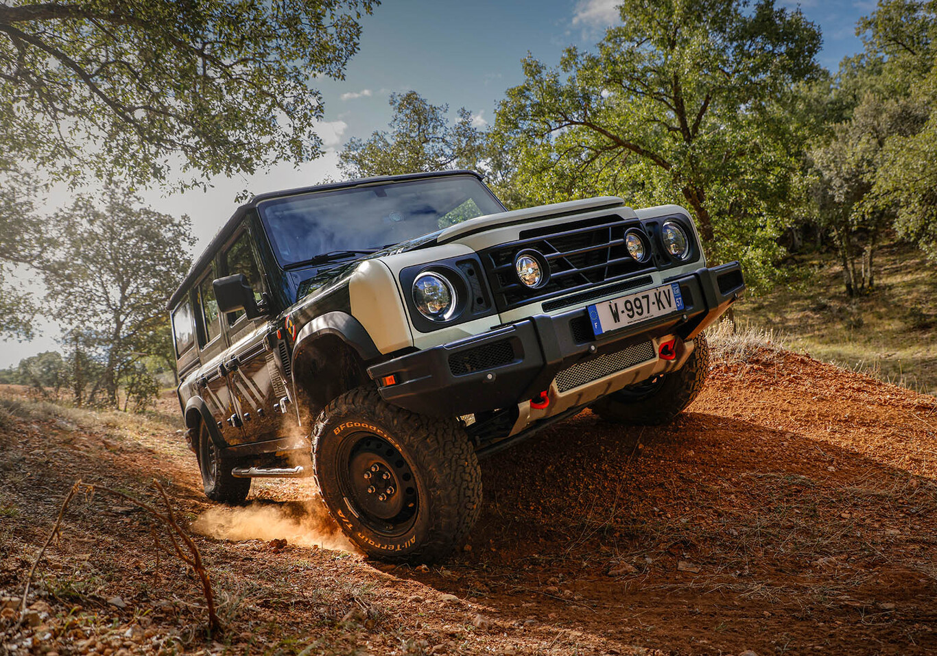 El Grenadier es un coche imponente, aunque en medio del campo no lo parezca. Mide 4,97 m de largo y más de 2 metros de alto, con una altura libre de 25 cm. Estéticamente, recuerda al Defender original, pero es suficientemente diferente como para que Ineos ganara la demanda que le había interpuesto Land Rover porque consideraba que se parecía demasiado al Defender.