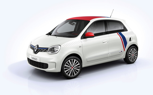 En esencia, el Twingo adopta los tres colores de la marca francesa, con franjas de color azul, blanco y rojo, así como el logotipo del gallo en diversos lugares (molduras laterales, alfombrillas, listones de los umbrales de las puertas...). Además, el diseño es asmiétrico, y en el lado del pasajero las franjas laterales culminan en el logotipo del gallo.