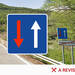 La señal R-6 significa "Prioridad respecto al sentido contrario". Tiene una forma cuadrada y un fondo azul. En él, una flecha blanca vertical hacia arriba indica que tienes prioridad de paso sobre los vehículos que vienen en sentido contrario. La flecha roja vertical hacia abajo, en cambio, indica que los vehículos que vienen en sentido contrario deben ceder el paso.