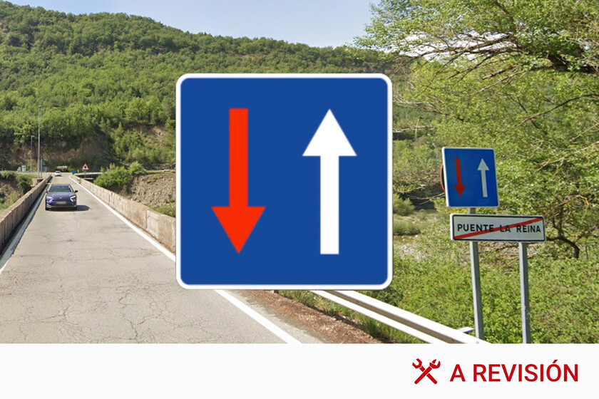 A la inversa, si al llegar al puente te encuentras con una señal redonda, blanca y de bordo rojo y en la que la flecha vertical hacia arriba es roja y la vertical hacia abajo es blanca significa que no tienes prioridad, sino los vehículos que vienen de frente. Se trata de la señal R-5, o "Ceda el paso al sentido contrario", es decir, debes ceder el paso.