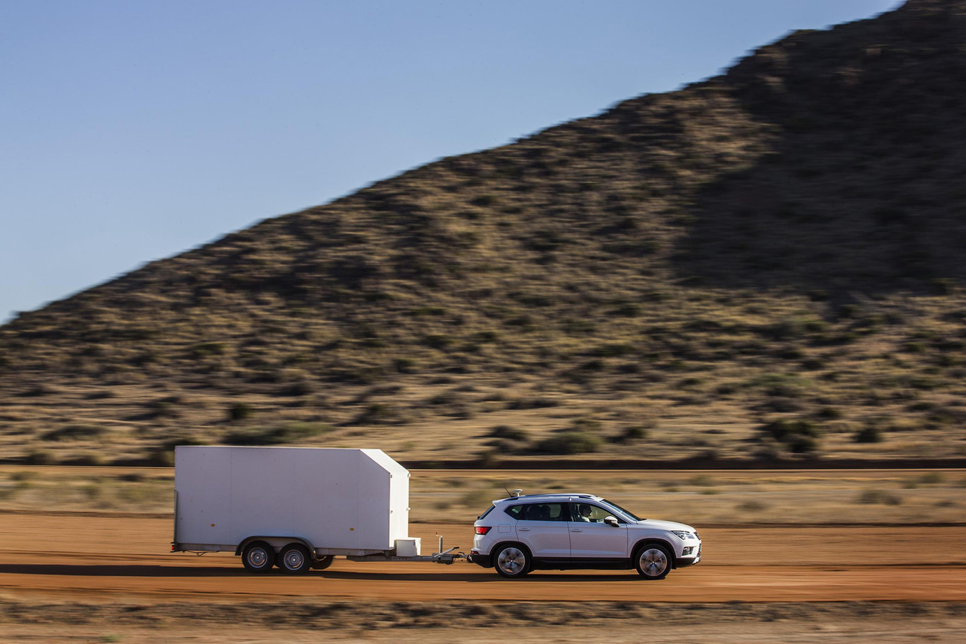 - Prueba de control de remolque. En los SUV es relativamente habitual llevar remolque, de ahí que el SEAT Ateca tenga en opción el Trailer Stability Program, un sistema que ayuda a mantener la estabilidad del coche cuando éste lleva anclado un remolque. Este elemento también se pone a prueba en las zonas desérticas donde como es evidente, al tener piso de tierra, es más sencillo que el remolque pierda el control y deje de seguir al coche.