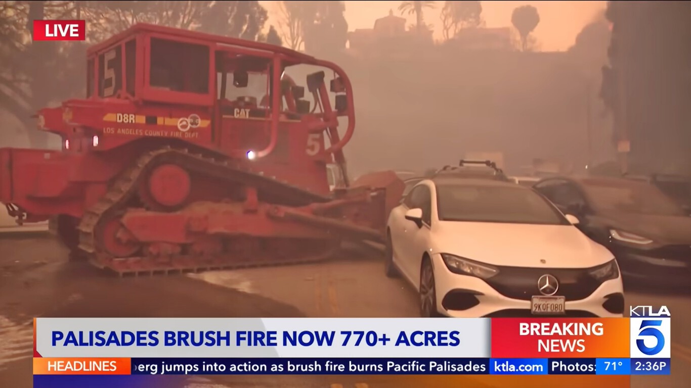 "Los bomberos del condado de LA tienen que hacer lo que tienen que hacer. Necesitan actuar rápido", explica el reportero de KTLA, en pleno epicentro de la tragedia. En la imagen vemos decenas de coches formando un atasco enorme, muchos de ellos eléctricos, pues California es el feudo de los cero emisiones en EEUU. No hay conductores en su interior, lo que es buena noticia porque se entiende están a salvo.