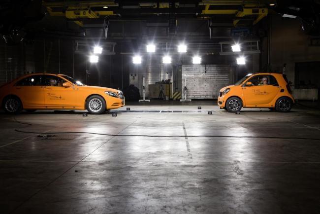 Bien, pues hoy vamos a ver en qué se materializa esa filosofía de seguridad para la vida real cuando se trata de chocar coches. De entrada, una anotación: el smart fortwo ha completado el mismo programa de desarrollo para pruebas de choque que se realizó con el Mercedes-Benz Clase C. Y entre otras pruebas, tuvo que superar una colisión contra el Mercedes-Benz Clase S. 1.124 kg contra 2.308 kg. Es decir, un choque en movimiento contra un vehículo cuya masa es 2,1 veces mayor.