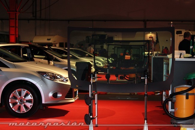 Focos, cámaras, música de estruendo mientras en las pantallas se muestra como en un talk show la espectacular presentación de los trabajadores que competirán en el pabellón. Hay una treintena de coches que ha aportado Ford y que esperan colocados en boxes delimitados por el color de la moqueta. En la planta alta otro coche nos espera; será el que utilizaremos los medios para hacer un cambio de lunas, como quien va a celebrar una fiesta en un chikipark.