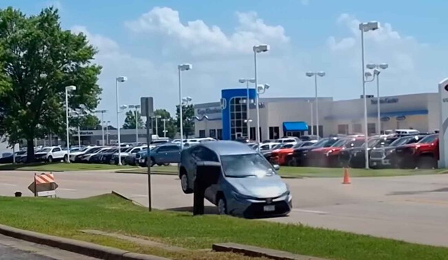 Ocurrió el pasado domingo 22 de junio, en Cape Girardeau (Missouri) jornada en la que los termómetros registraron hasta 42ºC en esta ciudad. Todo parecía tranquilo en este punto de la calle Seimers Drive cuando, de improviso, se escuchó un estallido y el asfalto se levantó. Un cono colocado en el firme saltó, como también lo hizo el compacto japonés a su paso.