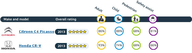 Tenemos dos nuevos resultados en la última batería de pruebas de EuroNCAP, que corresponden a dos lanzamientos recientes. Ambos han logrado la máxima puntuación, tanto el "Citroën C4 Picasso":https://www.motorpasion.com/monovolumen/citroen-c4-picasso-2013 como el "Honda CR-V":https://www.motorpasion.com/todoterrenos/honda-cr-v-1. En el caso del Honda, los modelos previos solo habían conseguido cuatro estrellas, en 2002 y 2007.
