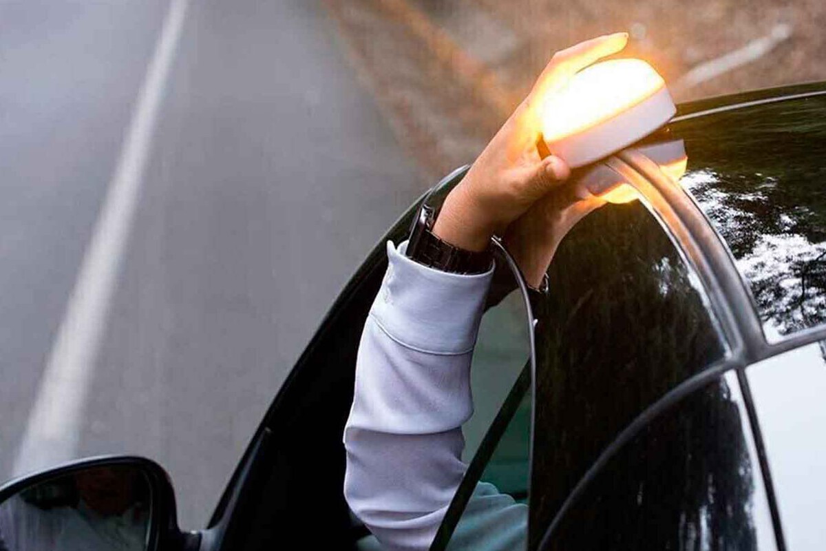 Activar y colocar la V16. La luz de emergencia conectada se activa normalmente pulsándola o bien con un botón. Se adhiere al techo del vehículo gracias a su base imantada, lo que podemos hacer sentados desde el interior del coche sacando el brazo por la ventanilla. Una vez la hemos encendido, tardará 100 segundos en enviar la señal a la DGT, apareciendo en los luminosos cercanos de la carretera y en las pantallas de los propios vehículos con tecnología de conectividad que circulen por la zona.