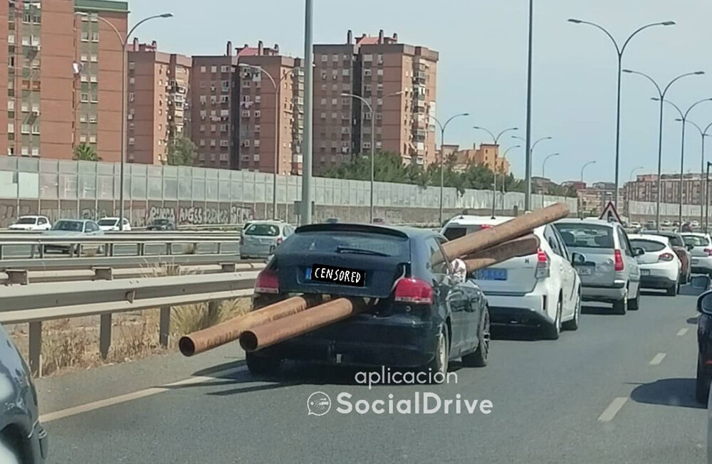 Ni corto ni perezoso, este conductor consideró que era buena idea transportar dos largos tubos en su coche de tres puertas: una carga que por dimensiones nunca debiera acarrear un turismo, ya que a todas luces sobresale mucho más de un 15 % de la planta del automóvil (el máximo permitido según determina el Reglamento General de Circulación).