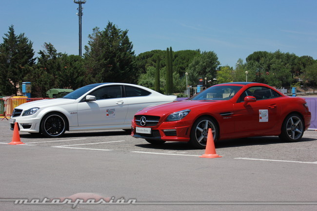 Interesante, pero nos hierve la sangre por probar el asfalto de Montmeló con los coches que hemos trasteado entre conos y charcos. El repertorio da como para elegir, entre los Mercedes C 63 AMG, SLK 55 AMG, B 200 CDI, C 250 CDI, CLS 350, E 350 CDI, S 400 Hybrid, SL 350, ML 350 Bluetec… Bueno, los AMG son el premio para los mejores alumnos del Curso. Y no, no nos ha tocado, así que los de Motorpasión nos quedamos sin, si no es que vamos con alguno de los monitores en sus vueltas locas.