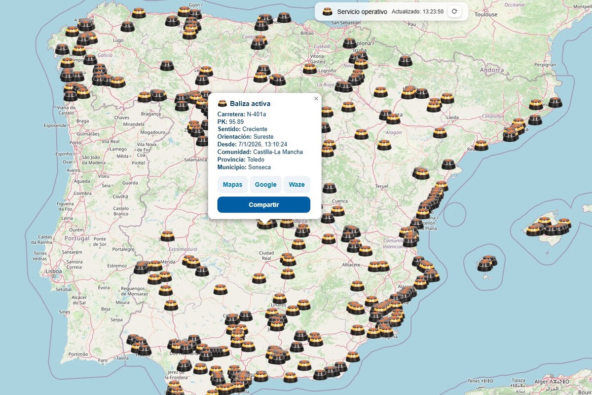Pero existe otro mapa no es oficial que no pertenece a la DGT -pero que se nutre con sus datos- que muestra claramente dónde hay de forma precisa una baliza V16 activada. En cuanto se ha puesto en marcha han surgido algunas críticas: ¿será la puerta de entrada a nuevos robos y estafas para los conductores?