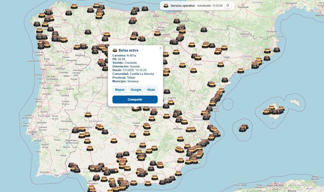 Pero existe otro mapa no es oficial que no pertenece a la DGT -pero que se nutre con sus datos- que muestra claramente dónde hay de forma precisa una baliza V16 activada. En cuanto se ha puesto en marcha han surgido algunas críticas: ¿será la puerta de entrada a nuevos robos y estafas para los conductores?